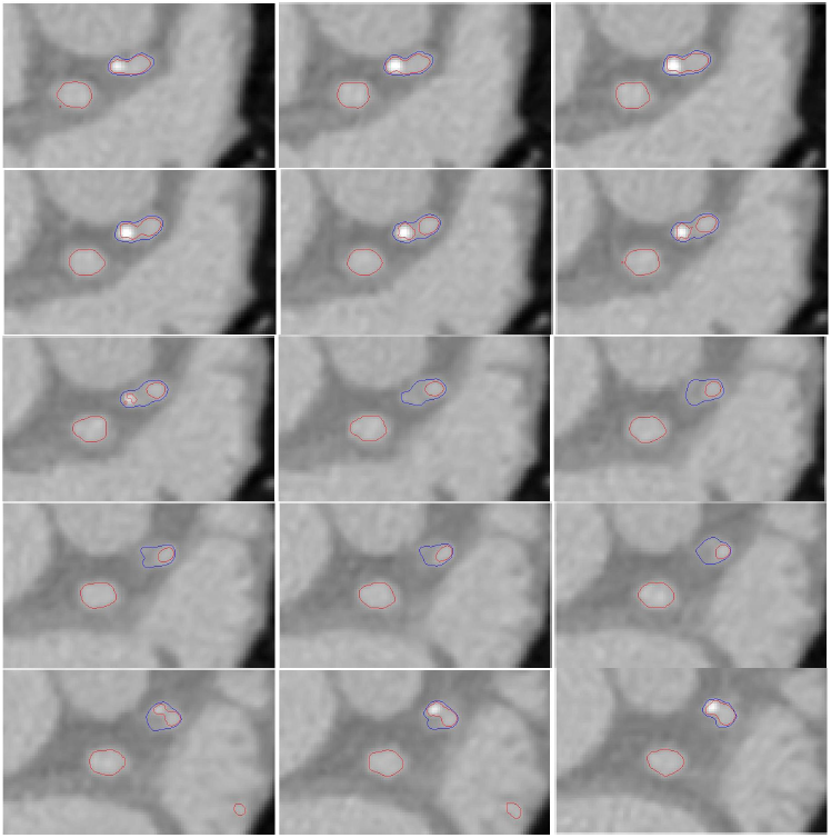 The results of the local region based evolution in 3D is given below. The local evolution was done for one of the two arteries visible in the slices shown below.