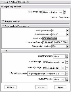 2. To get the transform in GUI, go to RigidRegistration module, use the default parameters to initialize (see figure), EXCEPT reduce iteration cout from the default to "100,100,50,20" 3. To get the transform with CLI, here's the command line you need to run: Slicer3 --launch RigidRegistration --fixedsmoothingfactor 0 --movingsmoothingfactor 0 --histogrambins 30 --spatialsamples 10000 --iterations 100,100,50,20 --learningrate 0.01,0.005,0.0005,0.0002 --translationscale 100 --outputtransform ./RigidRegistrationTransform-CLI.txt MRMeningioma0.nrrd MRMeningioma1.nrrd 4. To get the actual difference in the corner of your image using one transform vs another, you can run RigidRegistration in the testing mode: |