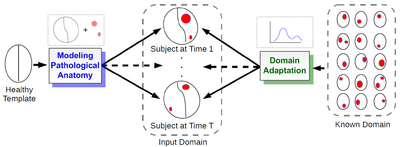 We propose a novel framework that models 4D changes in pathological anatomy across time, and provides explicit mapping from a healthy template to subjects with pathology. Moreover, our framework uses transfer learning to leverage rich information from a known source domain, where we have a collection of completely segmented images, to yield effective appearance models for the input target domain. The automatic 4D segmentation method uses a novel domain adaptation technique for generative kernel density models to transfer information between different domains, resulting in a fully automatic method that requires no user interaction. | We propose a novel framework that models 4D changes in pathological anatomy across time, and provides explicit mapping from a healthy template to subjects with pathology. Moreover, our framework uses transfer learning to leverage rich information from a known source domain, where we have a collection of completely segmented images, to yield effective appearance models for the input target domain. The automatic 4D segmentation method uses a novel domain adaptation technique for generative kernel density models to transfer information between different domains, resulting in a fully automatic method that requires no user interaction. | ||