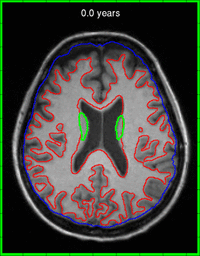 | − | [[File:Hd_subj_50073.gif| | + | [[File:Hd_subj_50073.gif|200px|center|thumb|'''Fig. 5.''' Animation of model estimated with image and shape data. A green border around the image represents interpolation within the observation interval (3 years). A red border represents extrapolation out to 10 years from baseline.]] |