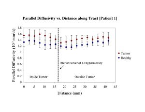 Clustered fibers in the region of the corticospinal tract have been used to identify regions of interest for slice-by-slice measurements of its diffusion properties in normals and tumor subjects. A pilot study (with Monica Lemmond at Harvard Medical School and Stephen Whalen and Alexandra Golby at Brigham and Women's Hospital/HMS) has demonstrated changes in tumor-affected tracts (relative to the contralateral side) beyond the apparent tumor border. A larger study is currently underway.