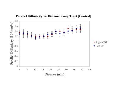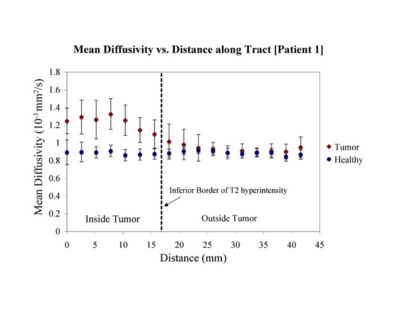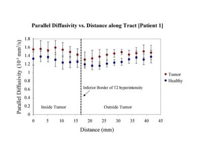 Clustered fibers in the region of the corticospinal tract have been used to identify regions of interest for slice-by-slice measurements of its diffusion properties in normals and tumor subjects. A pilot study (with Monica Lemmond at Harvard Medical School and Stephen Whalen and Alexandra Golby at Brigham and Women's Hospital/HMS) has demonstrated changes in tumor-affected tracts (relative to the contralateral side) beyond the apparent tumor border. A larger study is currently underway.
