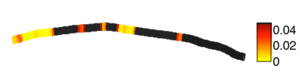 | − | + | [[Image:cingulumPValueOnFiber.png|thumb|left|300px|P-value for left/right hemisphere difference in FA (multiple comparison corrected using permutation testing). Significant differences are found especially in the anterior cingulum bundle]] | |