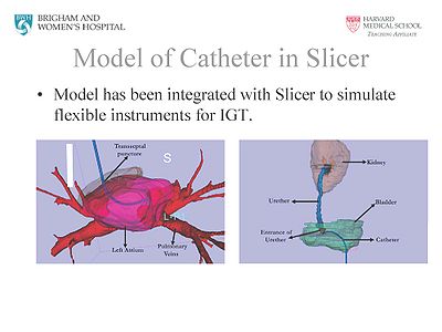 A model based on continuum dynamics has been developed to describe a flexible surgical instrument (catheters, endoscopes etc.). The model accurately describes the bending of the tool in both possible directions and also allows for the extensibility of the catheter. We will integrate this model with Slicer. In addition, we will also develop a virtual catheter module to aid in the navigation of the tool to the target location by providing magnified views of the anatomy as seen from the tool tip.