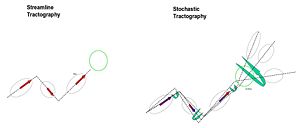 - Most tractography methods estimate fibers by tracing the maximum direction of diffusion. A limitation of this approach is that, in practice, several factors introduce uncertainty in the tracking procedure, including, noise, splitting and crossing fibers, head motion and image artifacts. To address this uncertainty, stochastic tractography methods have been developed to quantify the uncertainty associated with estimated fibers (Bjornemo et al., 2002). Method uses a propagation model based on stochastics and regularization, which allows paths originating at one point to branch and return a probability distribution of possible paths. The method utilizes principles of a statistical Monte Carlo method called Sequential Importance Sampling and Resampling (SISR). Based on probability functions, using a sequential importance sampling technique (Bjornemo et al., 2002), one can generate thousands of fibers starting in the same point by sequentially drawing random step directions. This gives a very rich model of the fiber distribution, as contrasted with single fibers produced by conventional tractography methods. Moreover, from a large number of sampled paths, probability maps can be generated, providing better estimates of connectivity between several anatomical locations. A comparison of the algorithms can be see here. (Figure 1)