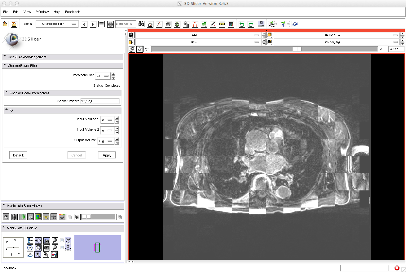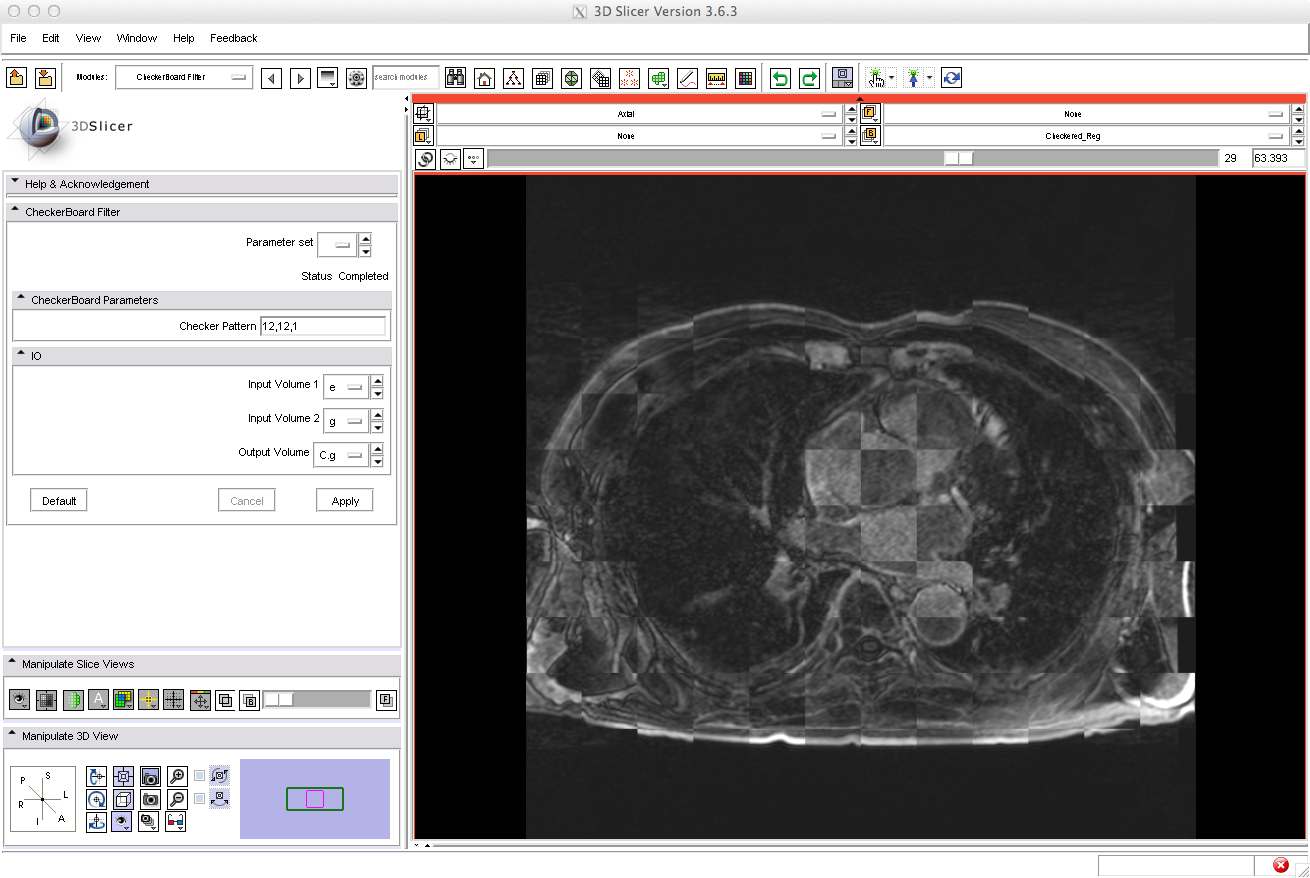 | 21:09, 9 November 2011 | Good Checker CARMA.png (file) | 394 KB | A combination of the registered whole-body pre- and post-ablation DEMRI images, where the lighter checkers represent the pre-ablation image. Good registration of the LA structures was seen. | 1 | |