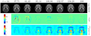 Longitudinal macaque developmental DTI atlas from postnatal day 14 to 180 as visualized on a center axial slice. Top row: Reconstructed atlas image at each age pulled back to day 14. The high quality of the longitudinal modeling is visible through the close similarity of the pulled-back atlas images. Middle row: Estimated change in FA between time points displaying major change occurring in the first 60 days (overshadowing the magnitude of later changes). Bottom row: Jacobian determinant of the pull-back deformation field. Cyan = no change, dark blue = growth (most of white matter), yellow-red = shrinkage (here seen on the 3rd ventricle in the center of the image)