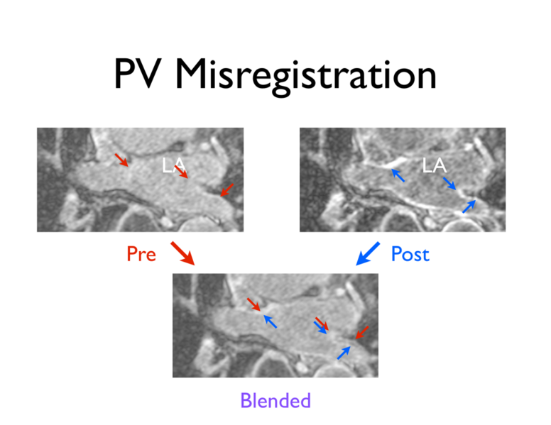 Affine and rigid registration (BrainsFit module) of the same patient's pre- and post-ablation scans improved the alignment of the PVs, but sufficient overlap of the corresponding PV structures was not achieved.