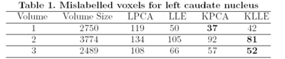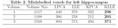 The surfaces are represented as the zero level set of a signed distance function and shape learning is performed on the embeddings of these shapes. We carry out some experiments to see how well each of these methods can represent a shape, given the training set. We tested the performance of these methods on shapes of left caudate nucleus and left hippocampus. The training set of left caudate nucleus consisted of 26 data sets and the test set contained 3 volumes. Error between a particular shape representation and ground truth was calculated by computing the number of mislabeled voxels using each of the methods. Figure 1 gives the error using each of the methods. Similar tests were done on a training set of 20 hippocampus data with 3 test volumes. Figure 2 gives the error table for each of the methods [1].