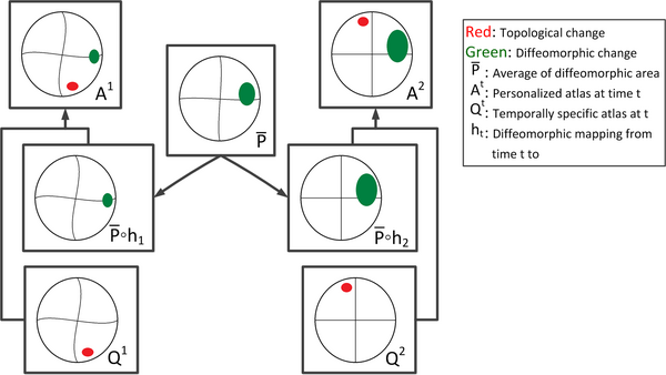 Longitudinal images with TBI present topological changes over time due to the effect of the impact force on tissue, skull, and blood vessels and the recovery process. We address this issue by defining a novel atlas construction scheme that explicitly models the effect of topological changes [2]. Our method automatically estimates the probability of topological changes jointly with the personalized atlas. The following figure shows our atlas construction scheme.
