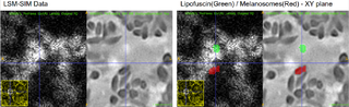 Individual granules (Lipofuscin and Melano-lipofuscin) in a zoomed view of LSM and SIM.