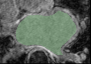 | Cropped MRI image overlaid with the algorithm-defined blood pool. | Expert manual segmentations (white) overlaid with the algorithm-defined blood pool (green). |