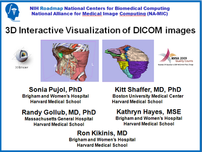 The 3D Interactive Visualization of DICOM Images with Slicer course is offered by the National Alliance for Medical Image Computing (NA-MIC) in conjunction with the Neuroimage Analysis Center (NAC) at the 95th Scientific Assembly and Annual Meeting of the Radiological Society of North America (RSNA 2009). As part of the outreach missions of these NIH funded National Centers, we have developed an offering of freely available, multi-platforms open source software to enable medical image analysis research. The course along with the tutorial 3D Visualization and Liver datasets aim to introduce translational clinical scientists to the capabilities of the 3D Slicer software. There will be additional demos of Slicer capabilities at the CTSA event on Tuesday morning.
