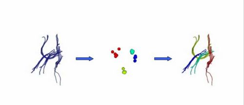 On the left example input tractographic paths are shown (these were created by manually seeding in the 3D Slicer). The center image shows an embedding of the tracts as points in 2D, where the distance between points is related to their shape similarity. This embedding was calculated as an intermediate step during spectral clustering. The image on the right shows the final output in the 3D Slicer, where tractographic paths are colored by cluster membership.